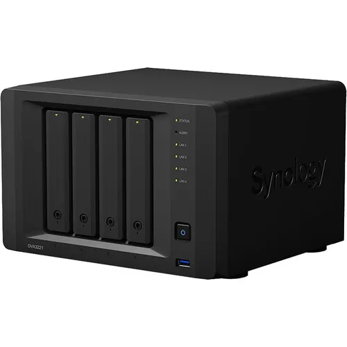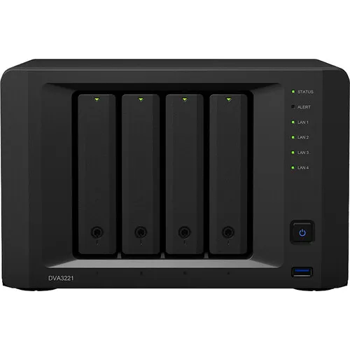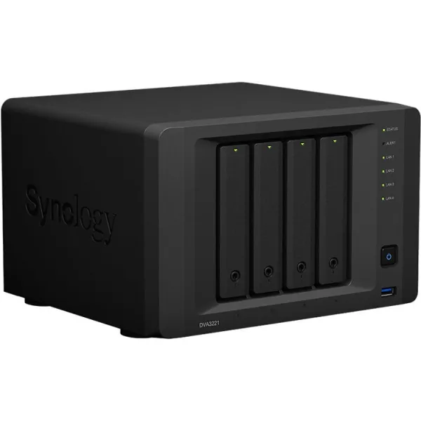The DVA3221 from Synology is a 4-bay desktop NVR surveillance solution that supports up to 32 IP channels (8 camera licenses included). This unit’s four SATA ports support raw storage up to 64TB. In addition, expansion units (available separately) can expand storage up to 224TB. Deep learning video analytics supported by the DVA3221 include facial recognition, people/vehicle detection, people counting, and intrusion detection.